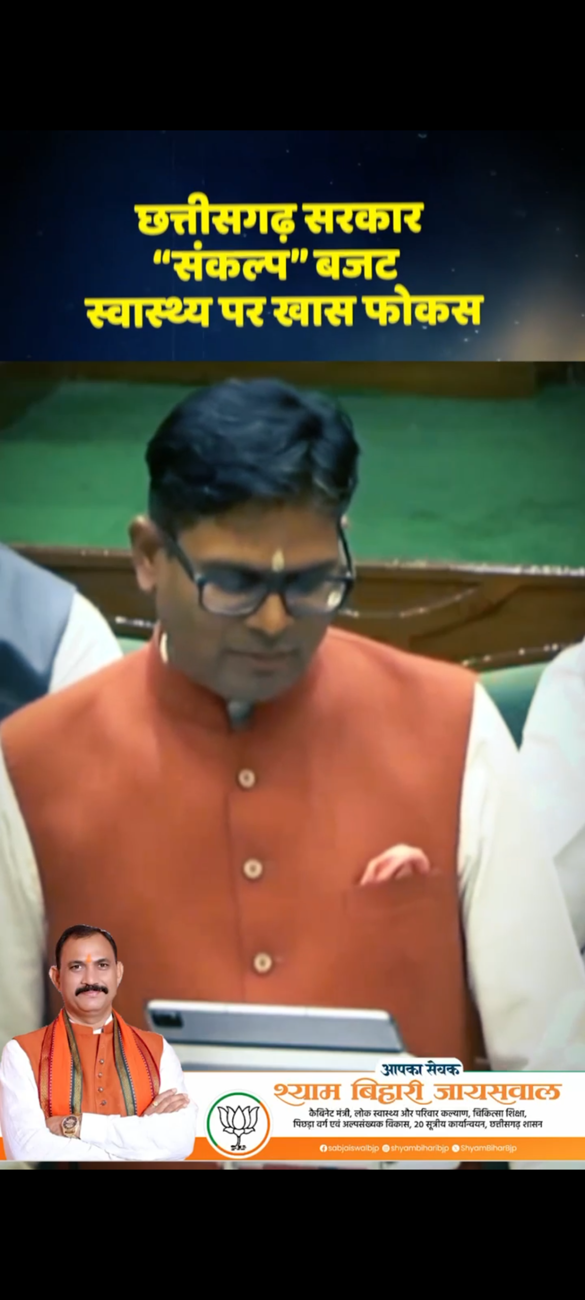 बजट 2026-27 राज्य के लिए लाभदायक, हर वर्ग के लिए बेहतर: स्वास्थ्य मंत्री श्याम बिहारी जायसवाल* *राज्य के शासकीय कर्मचारियों को कैशलैस चिकित्सा सुविधा देने का निर्णय ऐतिहासिक: स्वास्थ्य मंत्री* *स्वास्थ्य क्षेत्र को बजट में मिली प्राथमिकता पर स्वास्थ्य मंत्री ने मुख्यमंत्री एवं वित्त मंत्री का जताया आभार